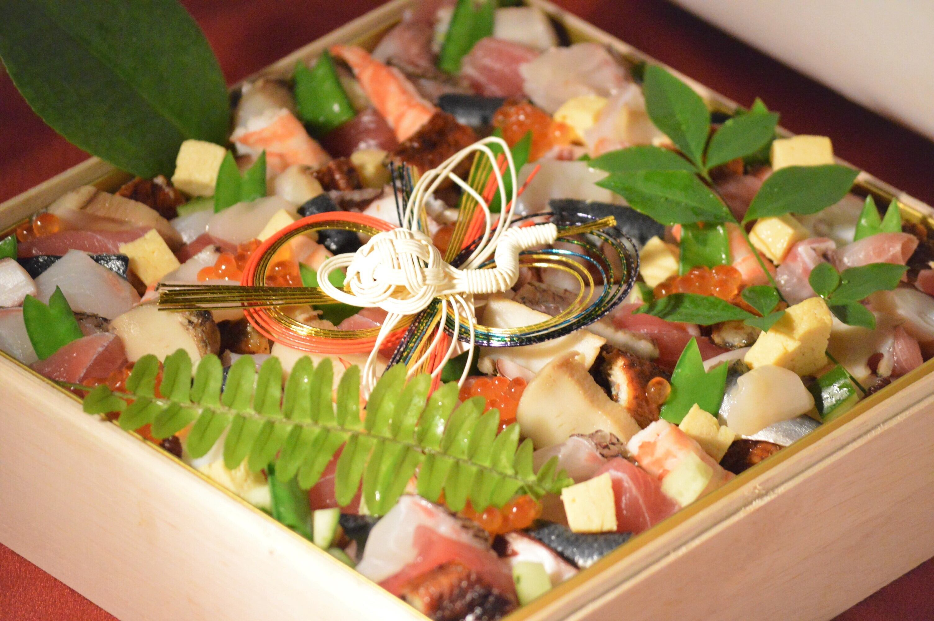 具材は本マグロ大トロ、車海老、ウニ、いくら、ブリ、真鯛、サーモン、平目、その他海鮮を贅沢に使用したお正月限定海鮮ちらし寿司です。